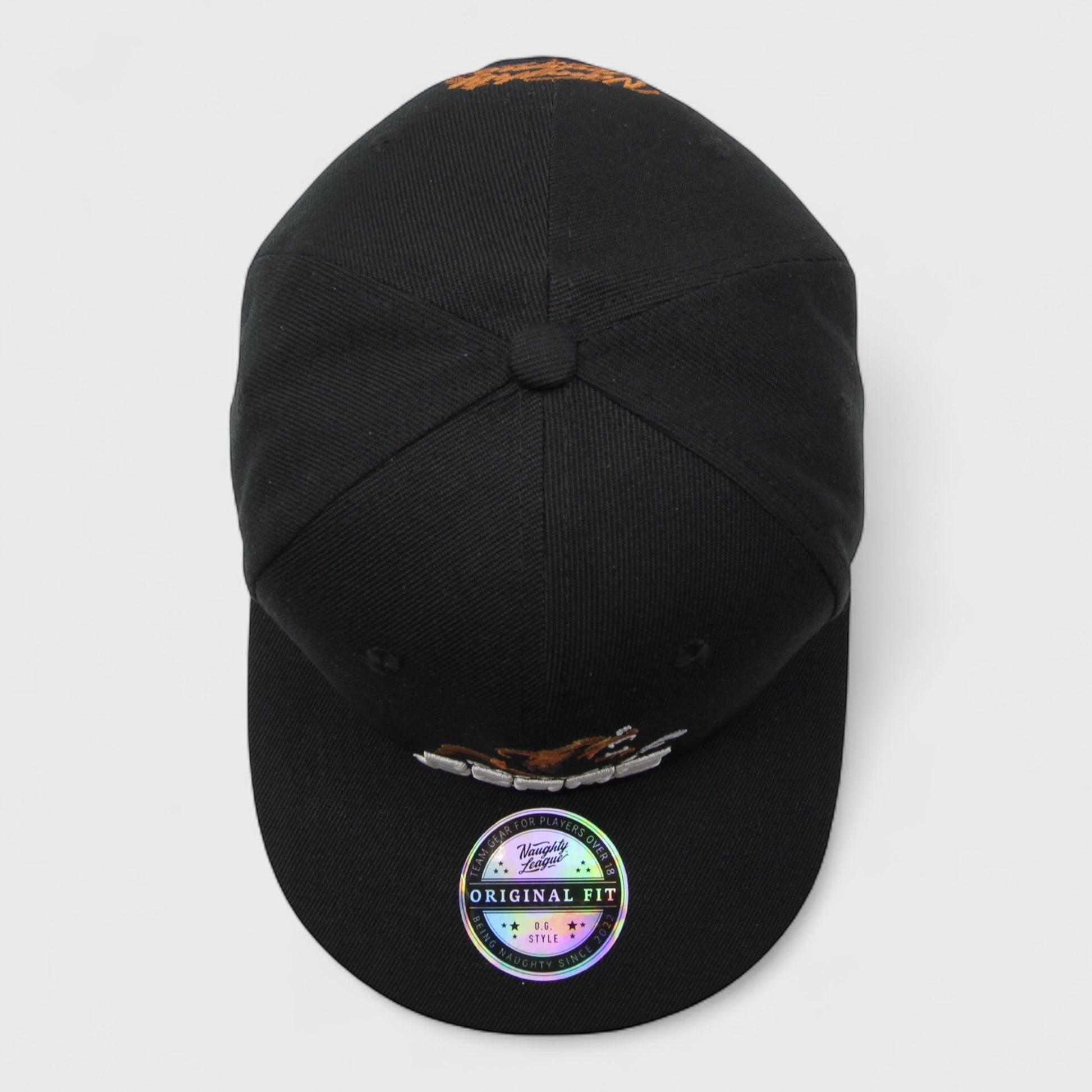- Embroidered Naughty League brand logo to the back